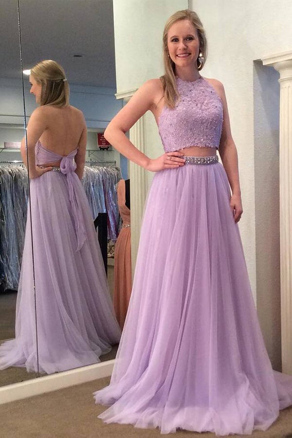 Lilac Halter Two Pieces Beaded Prom Dresses, Evening Dress With Appliques
