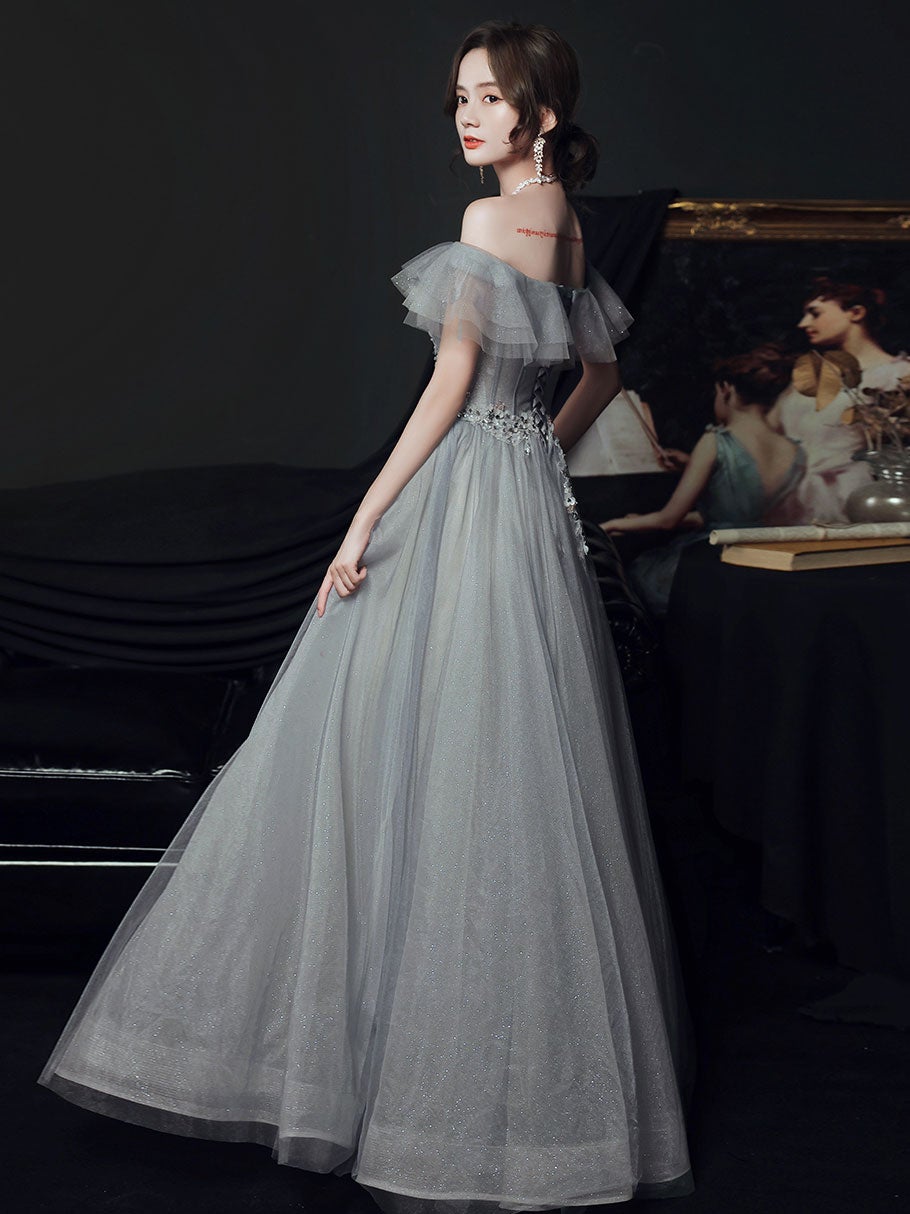 Gray tulle off shoulder long prom dress, gray tulle formal dress