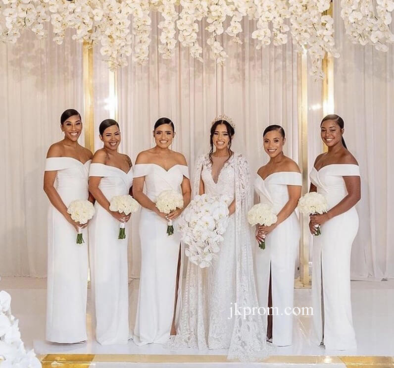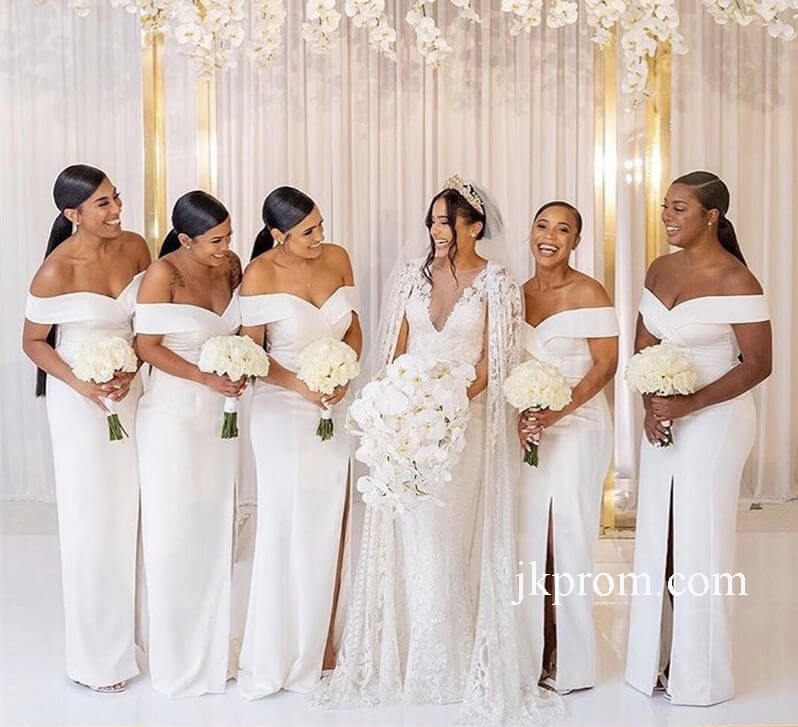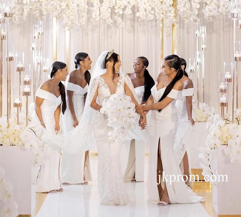 Modest Bridesmaid Dresses Mermaid Silk Satin Side Slit,White Wedding Party Dress