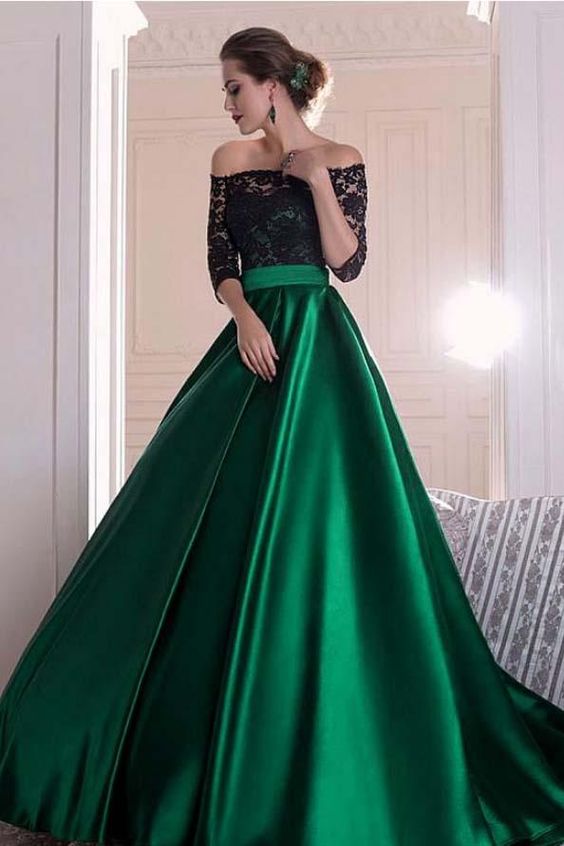 A Line Dark Green Satin Off the Shoulder 3/4 Sleeves Ruffles Lace Prom Dresses cg1344