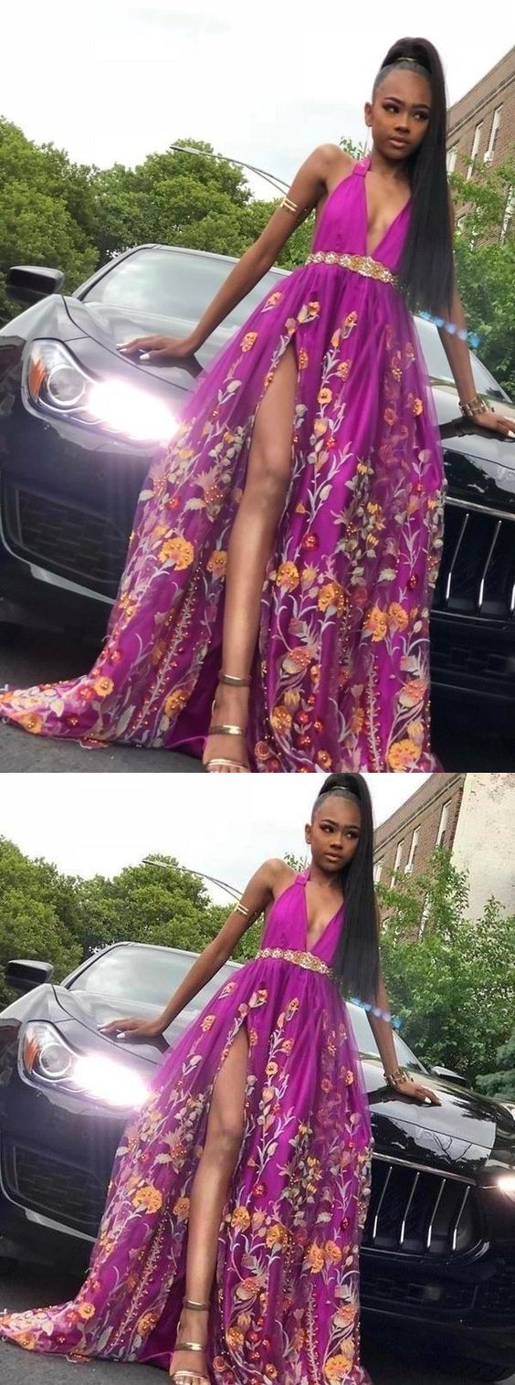 A Line Deep V Neck High Slit Purple Tulle Prom Dresses Long Evening Dresses cg8981