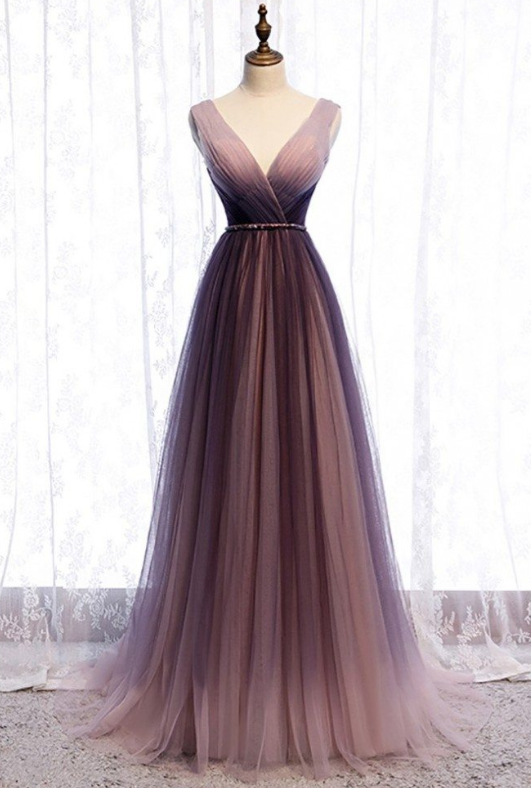 A-Line Deep V neck Pleated Purple Tulle Formal Prom Dress Flowing ED01412