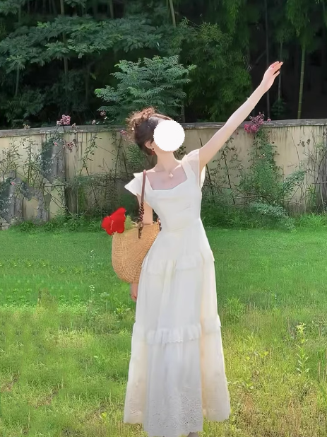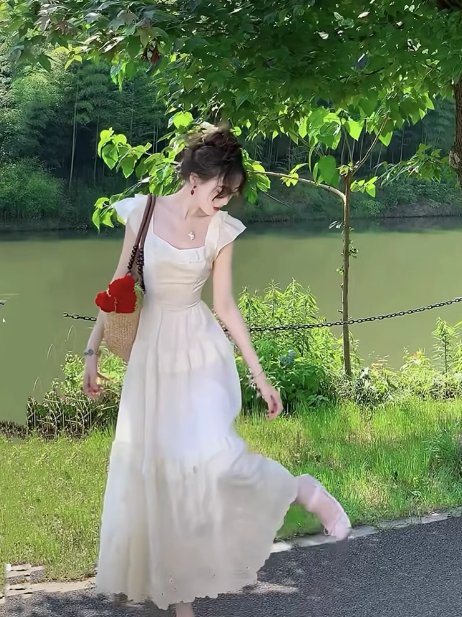 A-line heavy embroidery small flying sleeves square neck long dress cake skirt ED0307