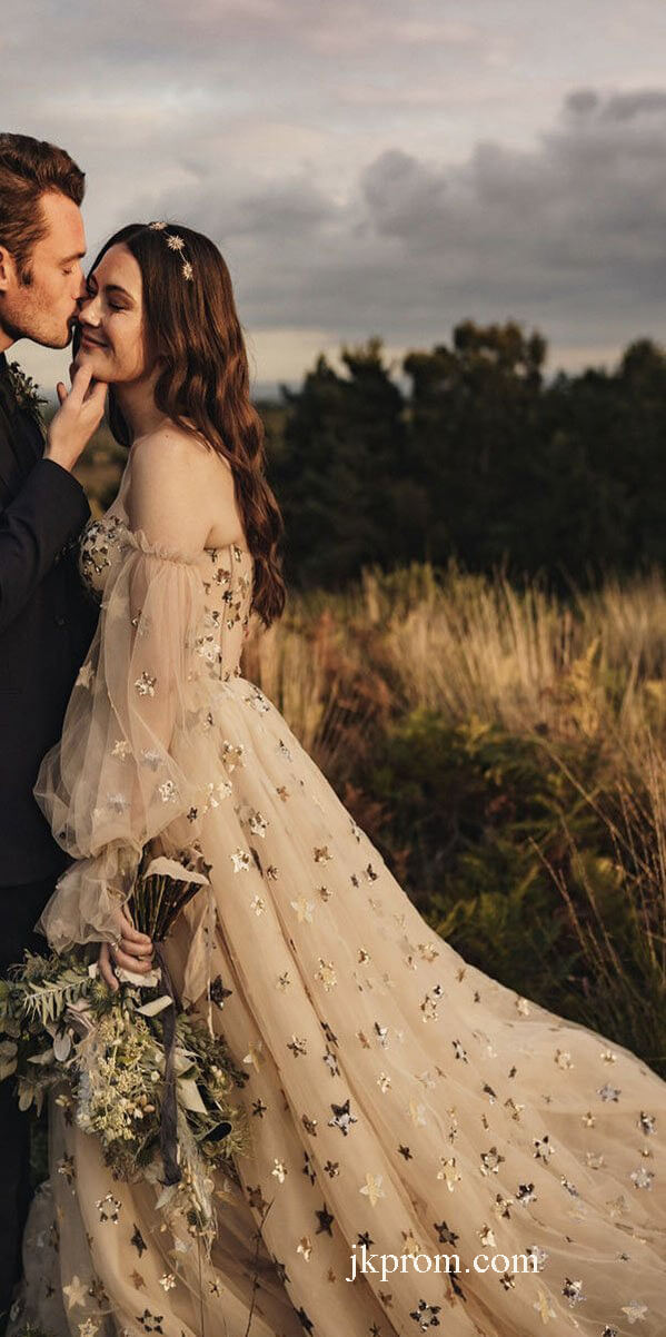 A-line Newest Unique Country Prom Dresses,Modest Long Sleeve Tulle Evening Dress