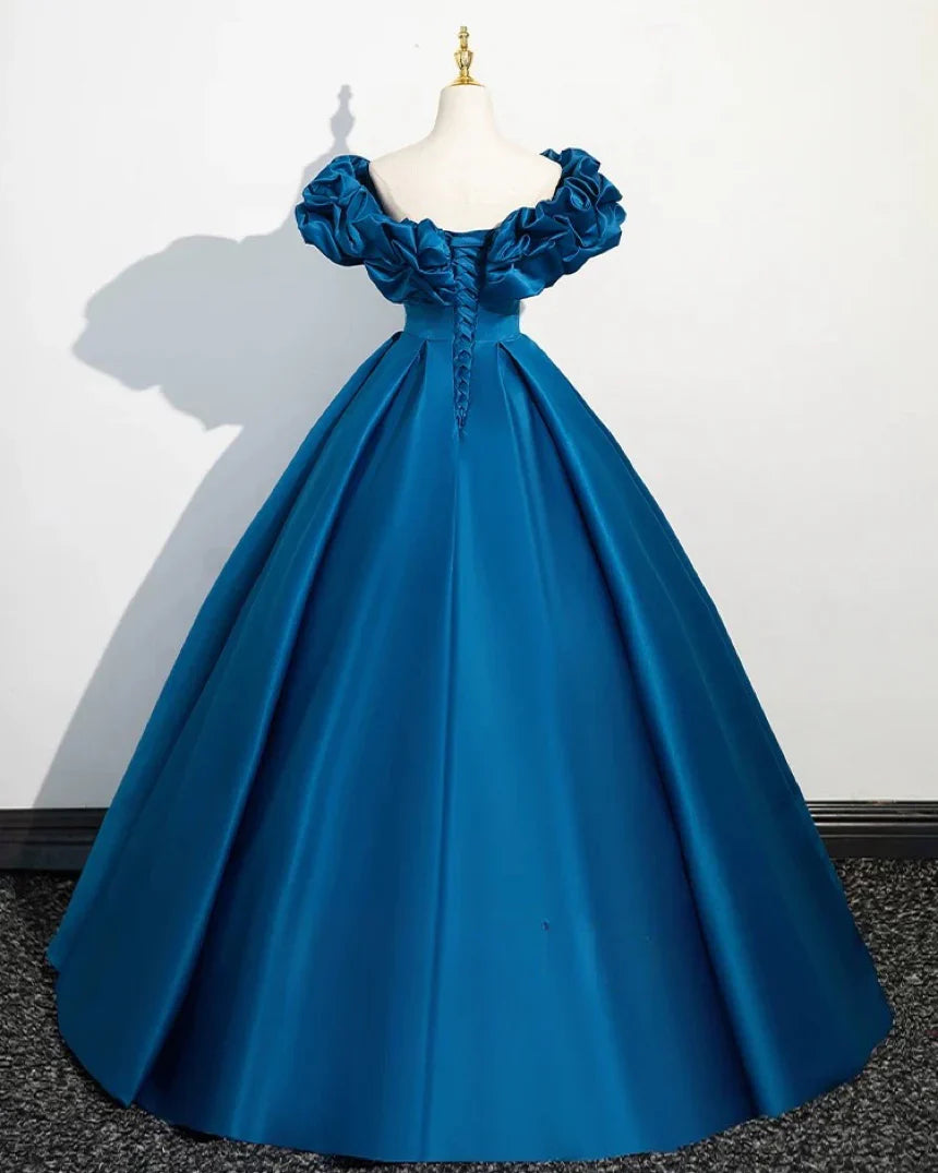 A-Line Off Shoulder Satin Blue Long Prom Dress, Blue Long Formal Dress ED014