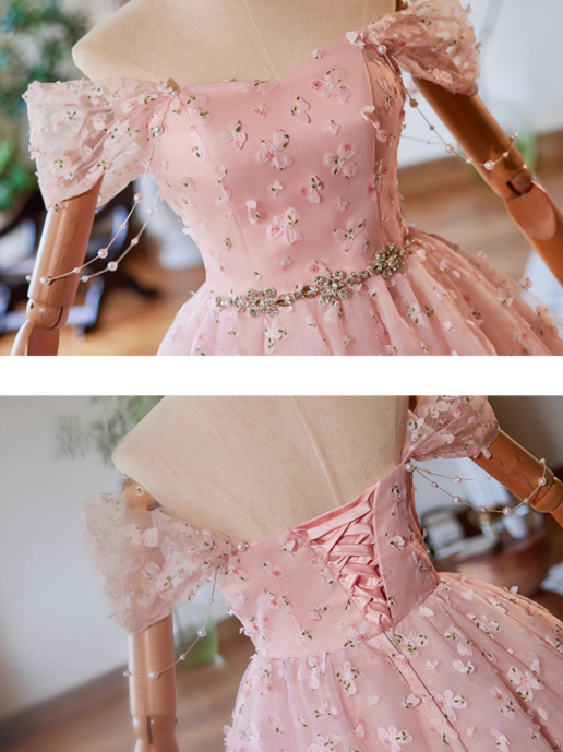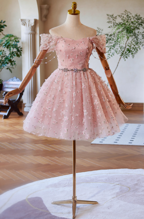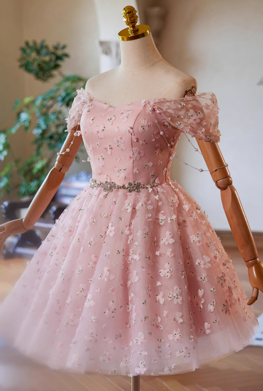 A-Line Off Shoulder Tulle Lace Pink Short Prom Dress, Pink Homecoming Dress ED023