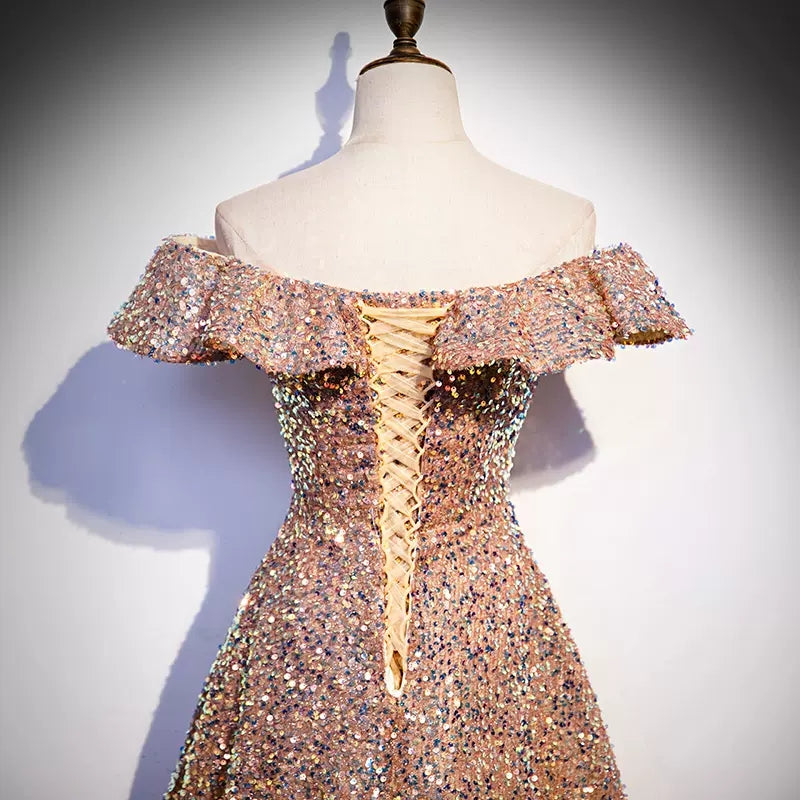 A line Off the Shoulder Pink Sequin Long Prom Dresses SH129