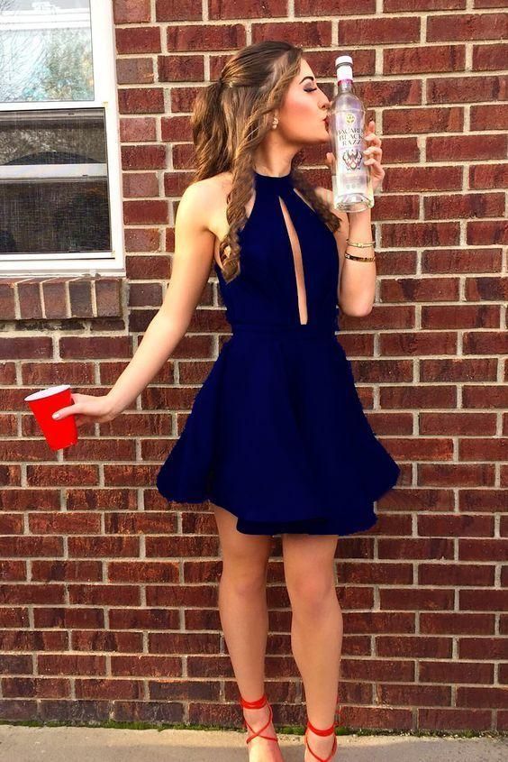 A-Line Round Neck Keyhole Little Black Satin Homecoming Dress cg7618