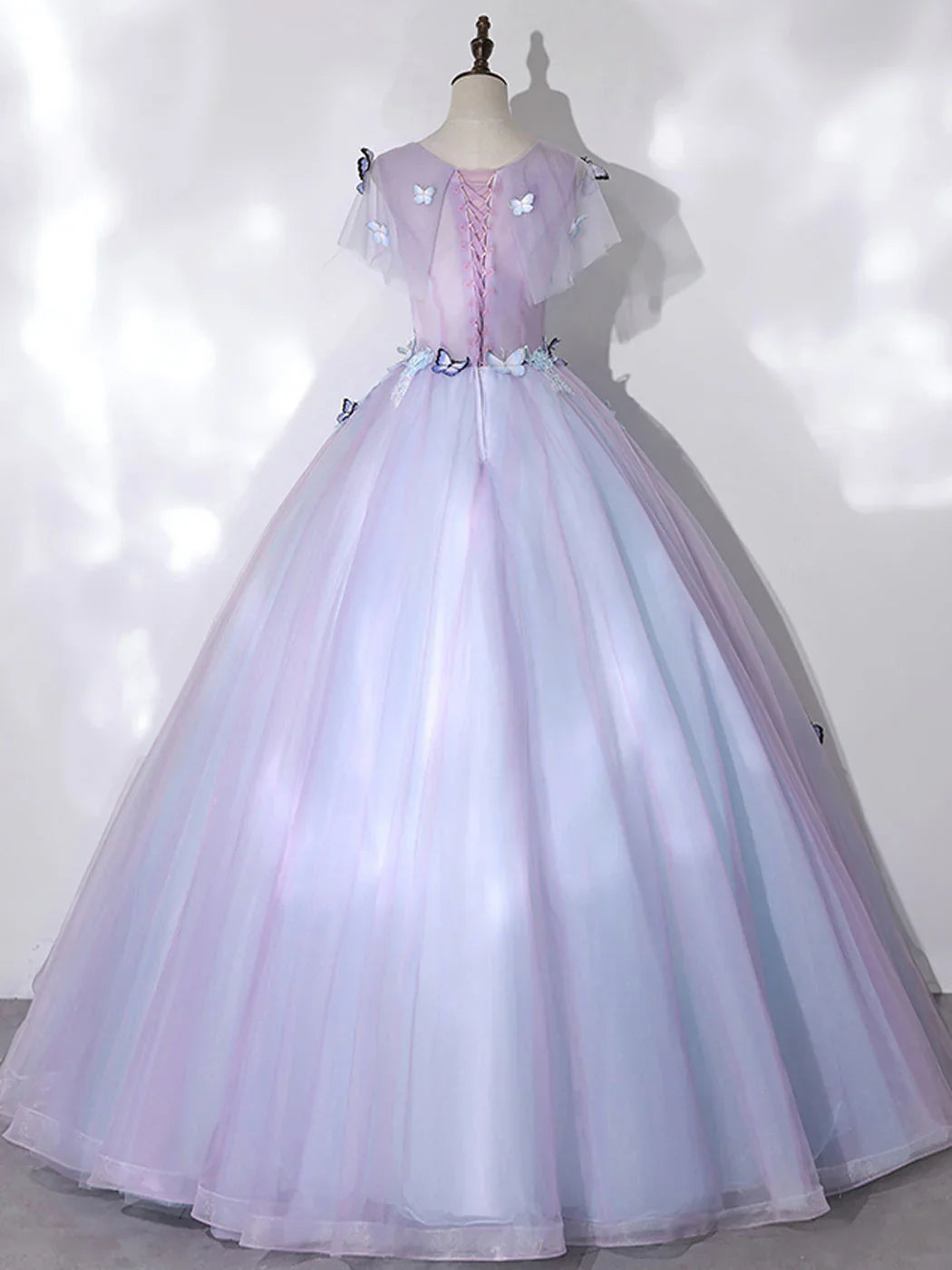A-Line Round Neck Tulle Lace Purple Long Prom Dress, Purple Formal Dress ED0704