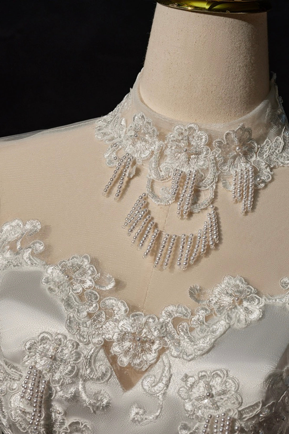 A-Line Satin Lace Long Sleeve Prom Dress, Elegant White High Neck Evening Prom Dress