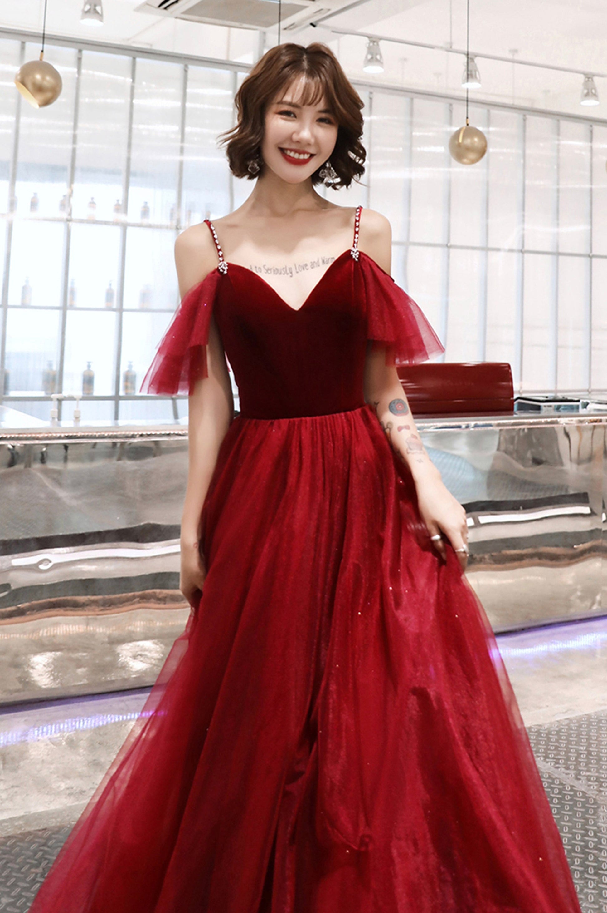 _the Burgundy A-Line Spaghetti Straps Long Prom Dress, a vision of simplicity and sophistication in one exquisite gown. This dress is the epitome of timeless elegance, making it an ideal choice for prom night, formal events, or any special occasion.