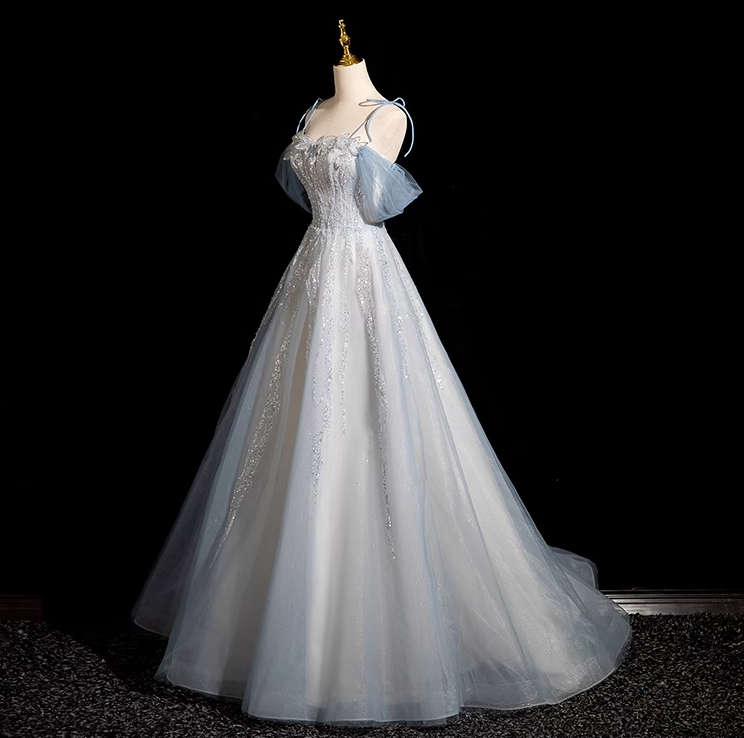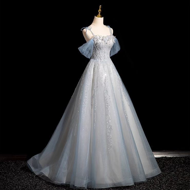 A-line Spaghetti Straps Tulle Sequins Long Prom Dress, Sweet Beaded Evening Dress ED01474