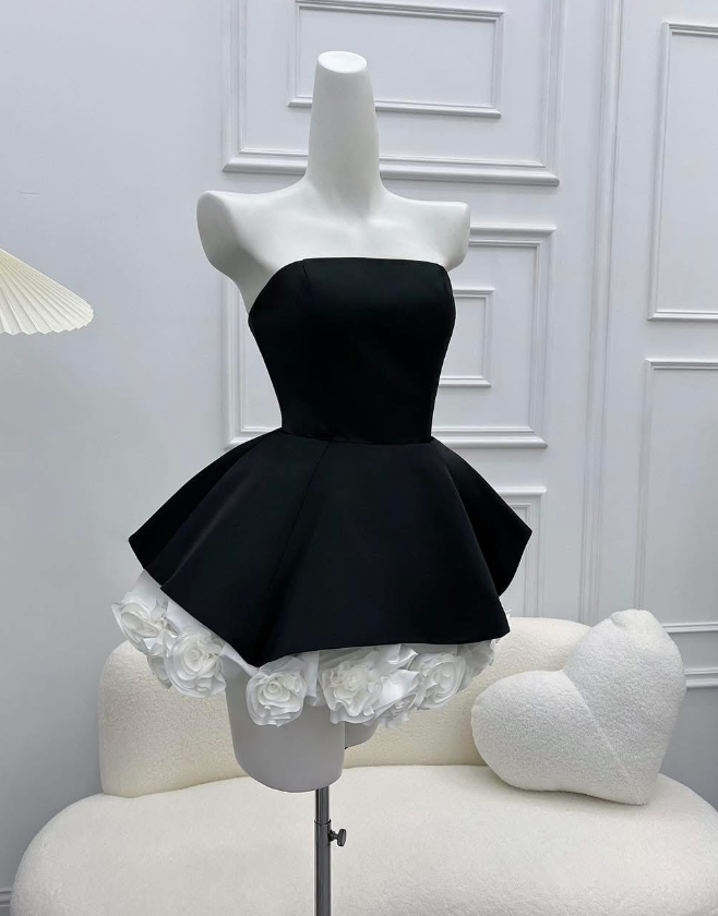 A Line Strapless Flower White Satin Black Velvet Short Homecoming Dress Cocktail Dress SH3119
