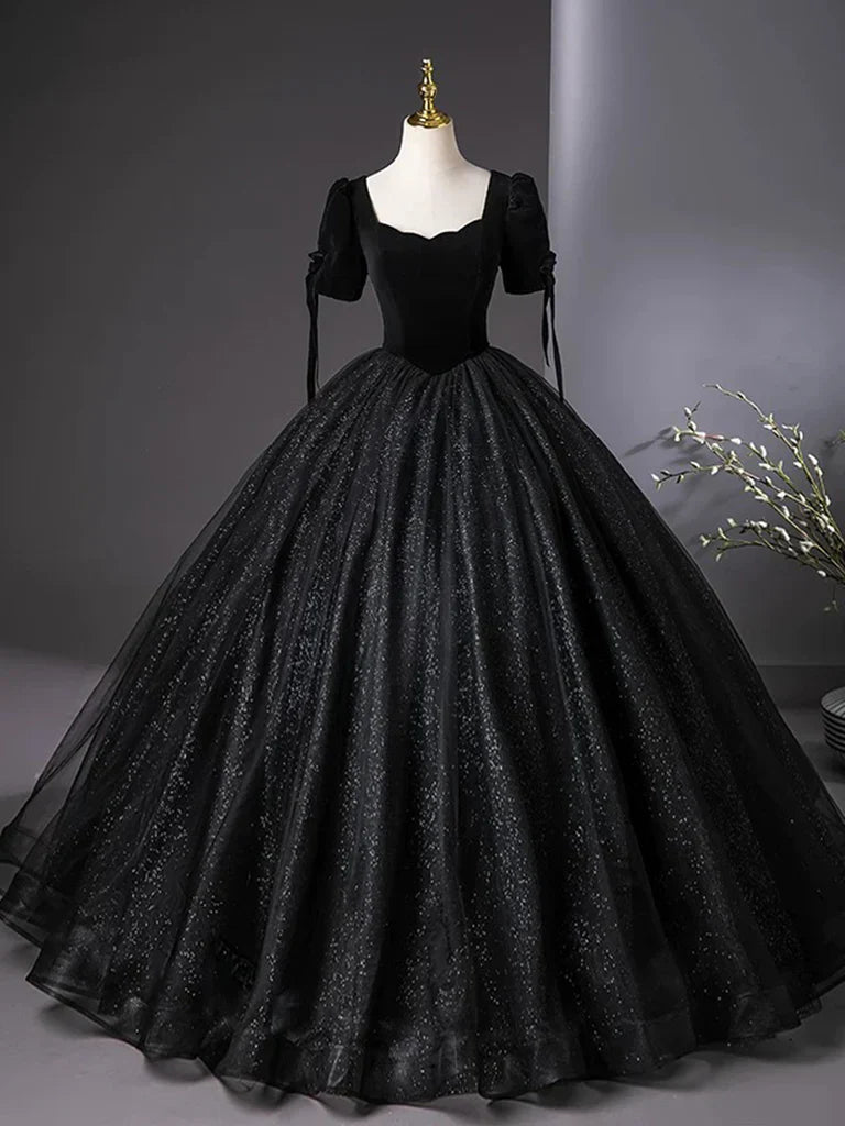 A-Line Tulle Velvet Sequin Black Long Prom Dress, Black Long Evening Dress ED01135