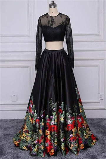 A line Two Piece Black Long Sleeve Prom Dress With Floral Print Skirt Evening Dresses KS6541