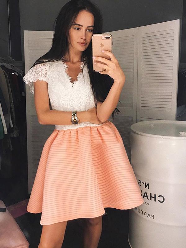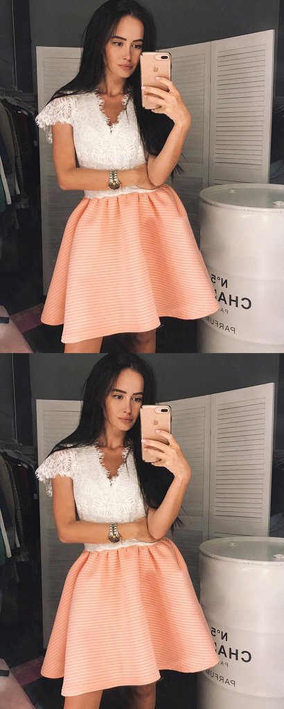 A-Line V-Neck Cap Sleeves Homecoming Dresses With Lace cg2564