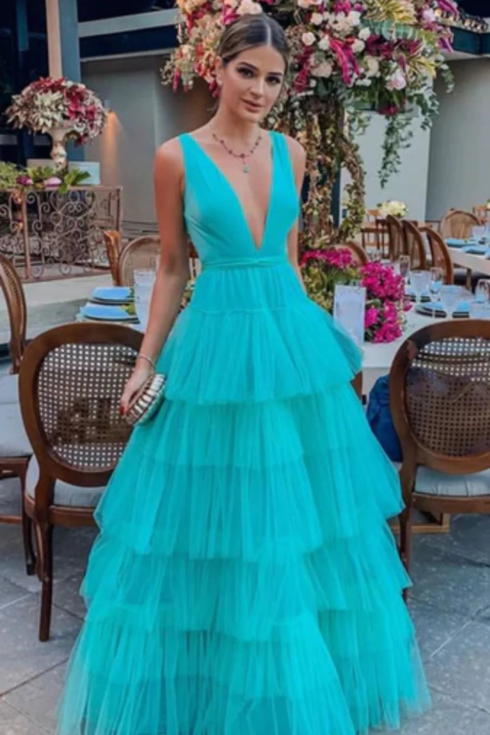 Blue fashion V-neck elegant A-line long floor-length tulle ball gown evening dress wedding guest party dress gh980