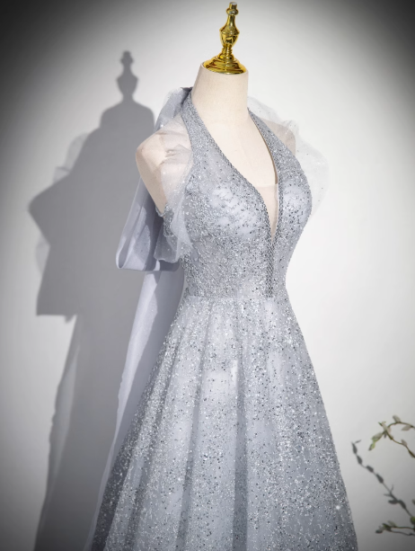 A-line V-neck mesh sequin long prom dress, evening dress ED0967