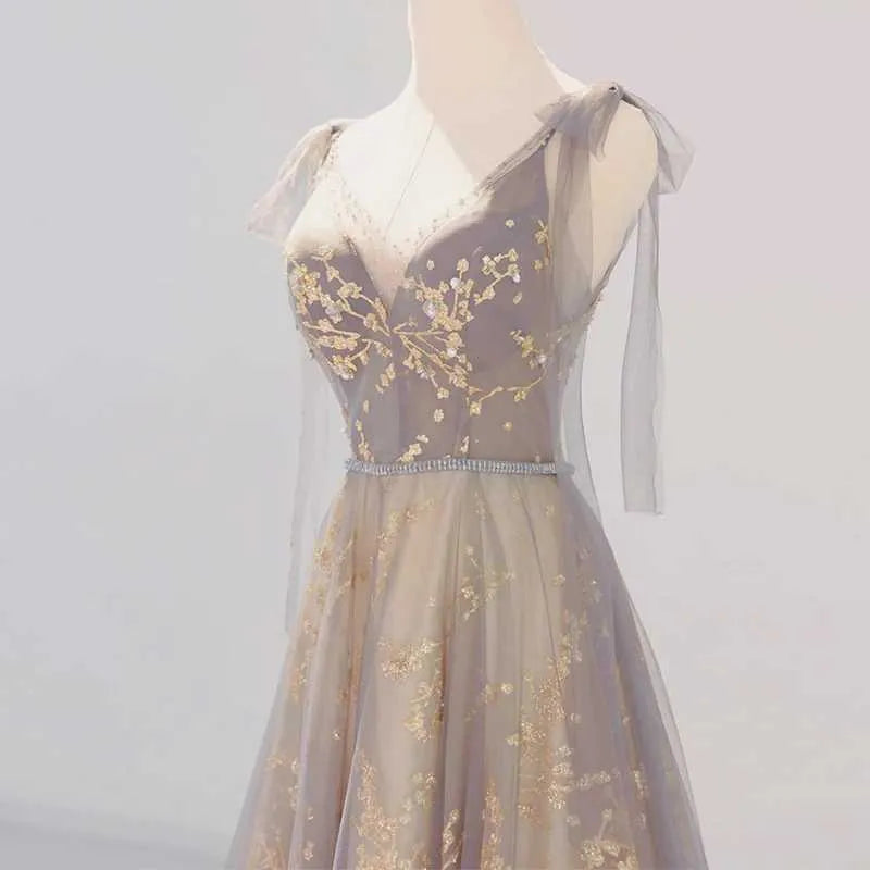 A-Line V Neck Tulle Long Prom Dresses, Tulle Formal Evening Dresses ED0708
