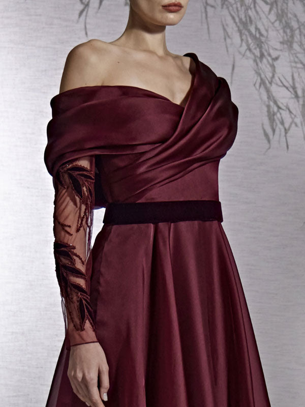 Asymmetric Off The Shoulder Velvet Leaves Dress