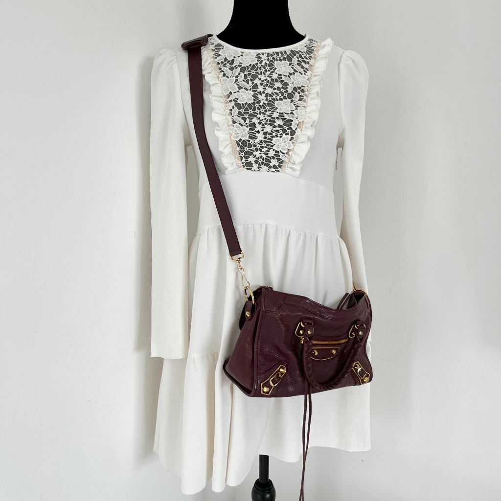 Balenciaga burgundy small metallic edge city leather bag with gold hardware and black fabric interior.