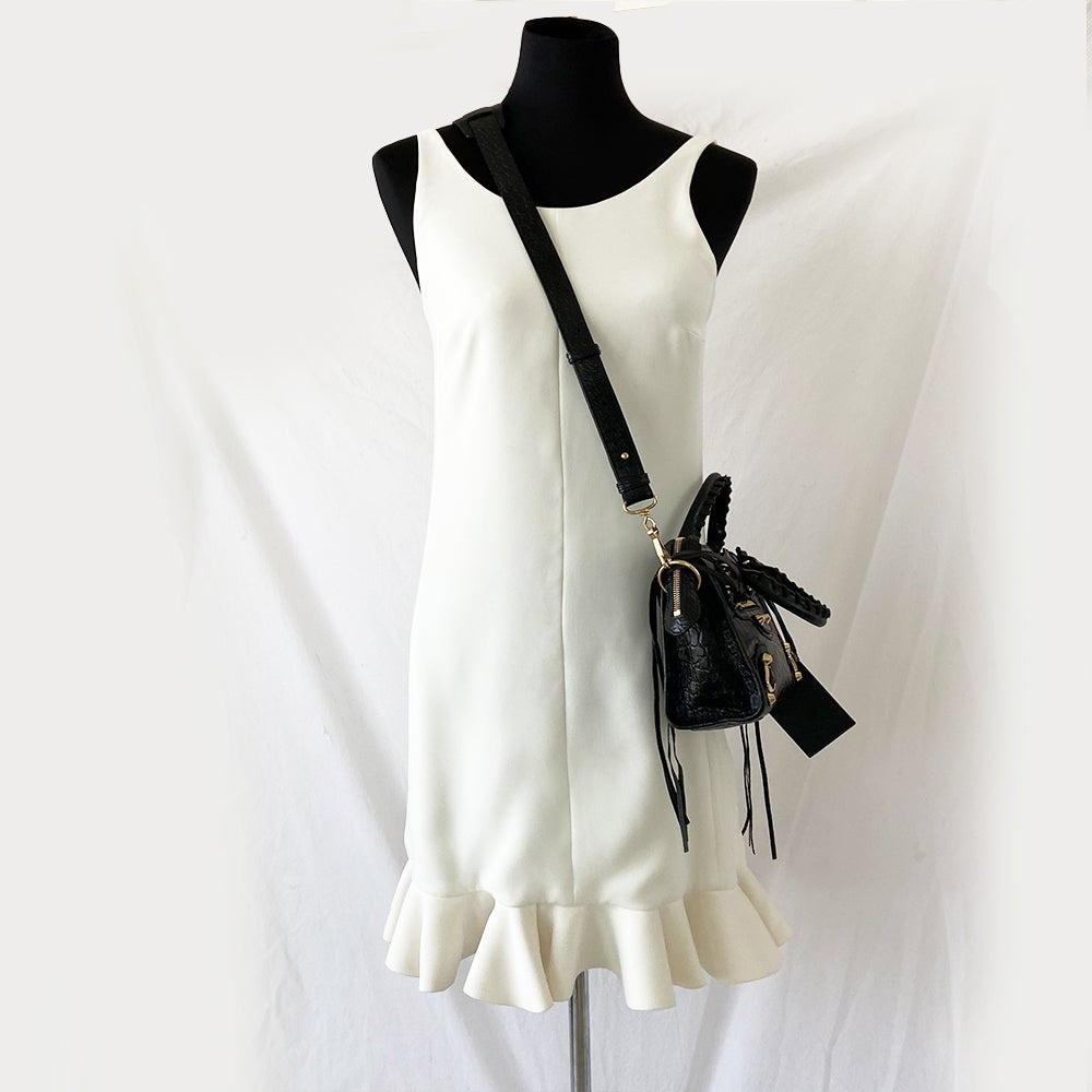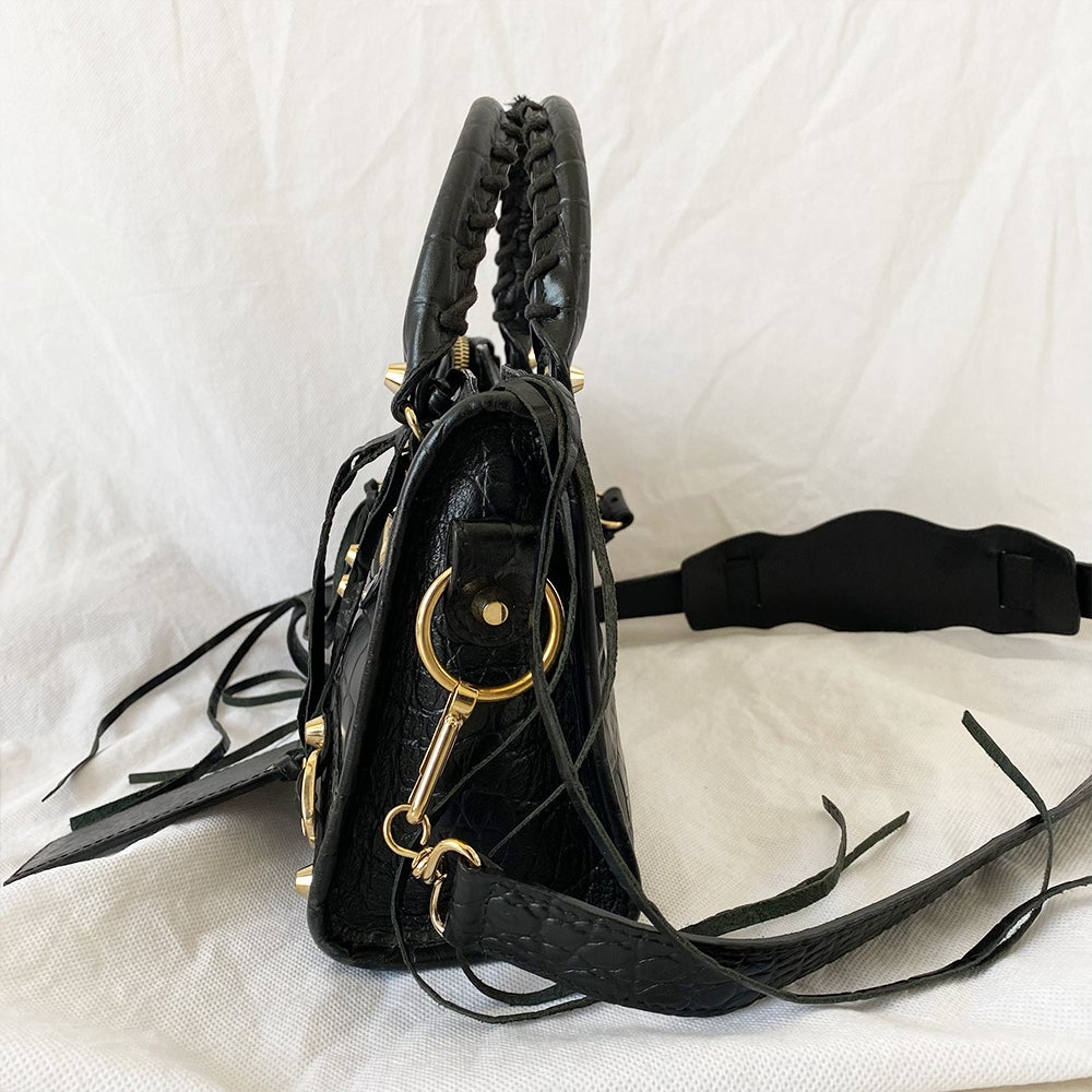 Description : Balenciaga Giant 12 City mini croc embossed black bag with gold hardware, buckle details and studs on front with front zipper. Has two top handles, a shoulder strap and fabric interior