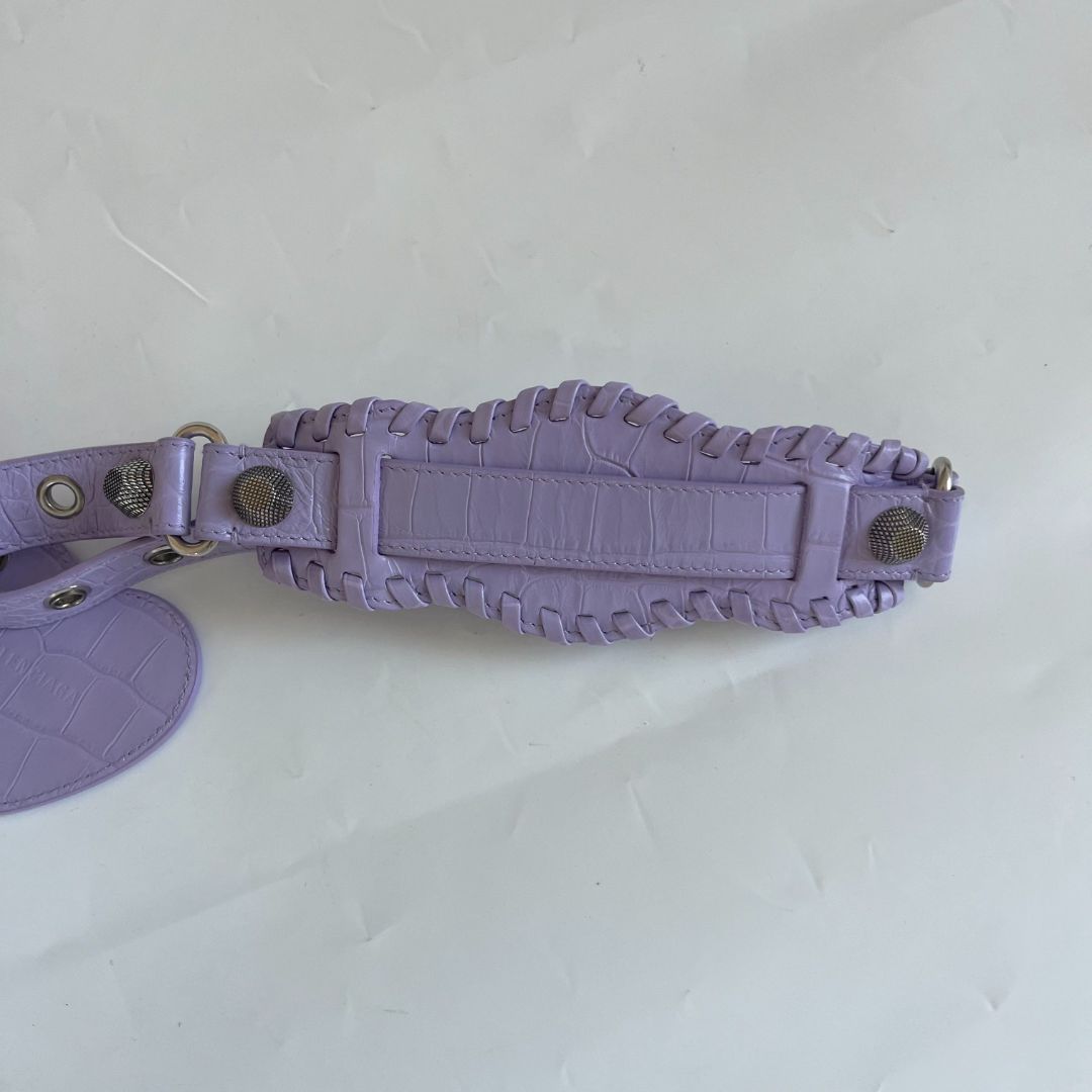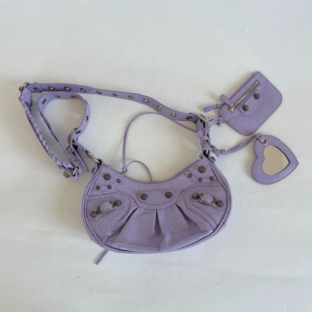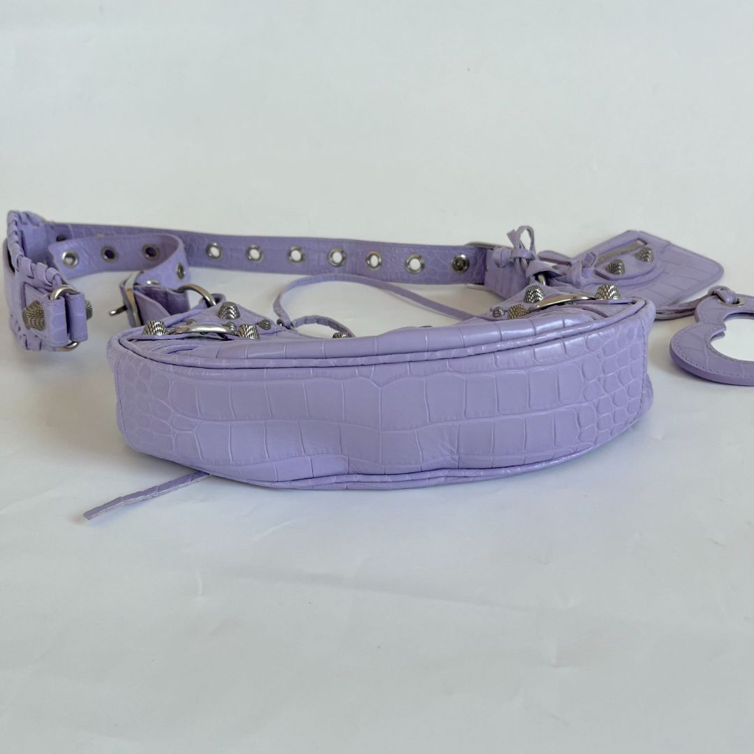 Balenciaga Le Cagole XS Shoulder Bag in Crocodile Embossed Calfskin, featuring Grained lambskin shoulder bag in purple. Engraved studs and pin-buckle hardware throughout. Adjustable shoulder strap with pin-buckler fastening, detachable zip pouch and mirror at strap. Black cotton canvas lined interior