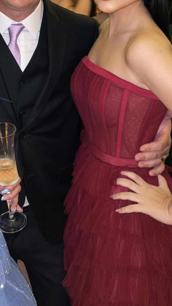 Ball Gown Long Strapless Tiered Tulle Burgundy Prom Dress P1896