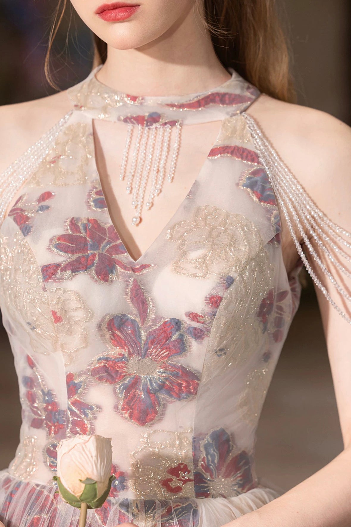Beautiful Floral Tulle Long Prom Dress, A-Line Halter Evening Party Dress