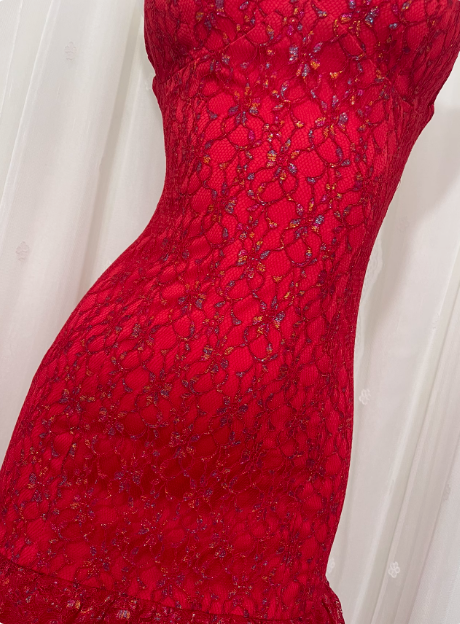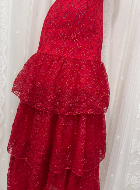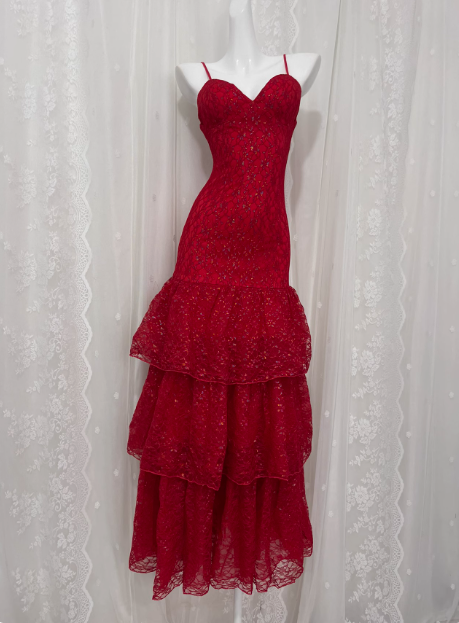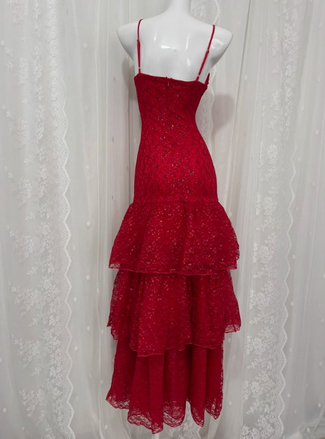 Beautiful Red Sling Lace Waist Ruffle Cake Skirt Prom Dress P3467
