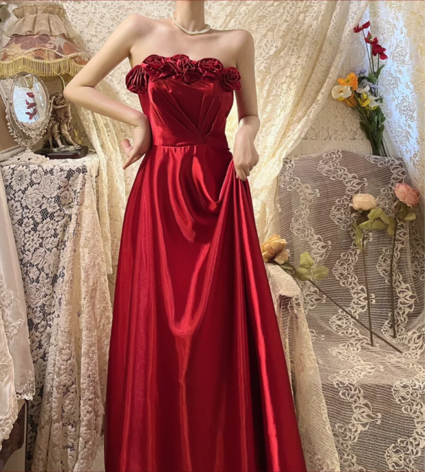 Beautiful Red Strapless Three-dimensional Rose Satin A-line Long Prom Dress P3768
