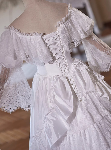 Beautiful White Satin Lace Off-the-shoulder Floor-length Wedding Dress P2640