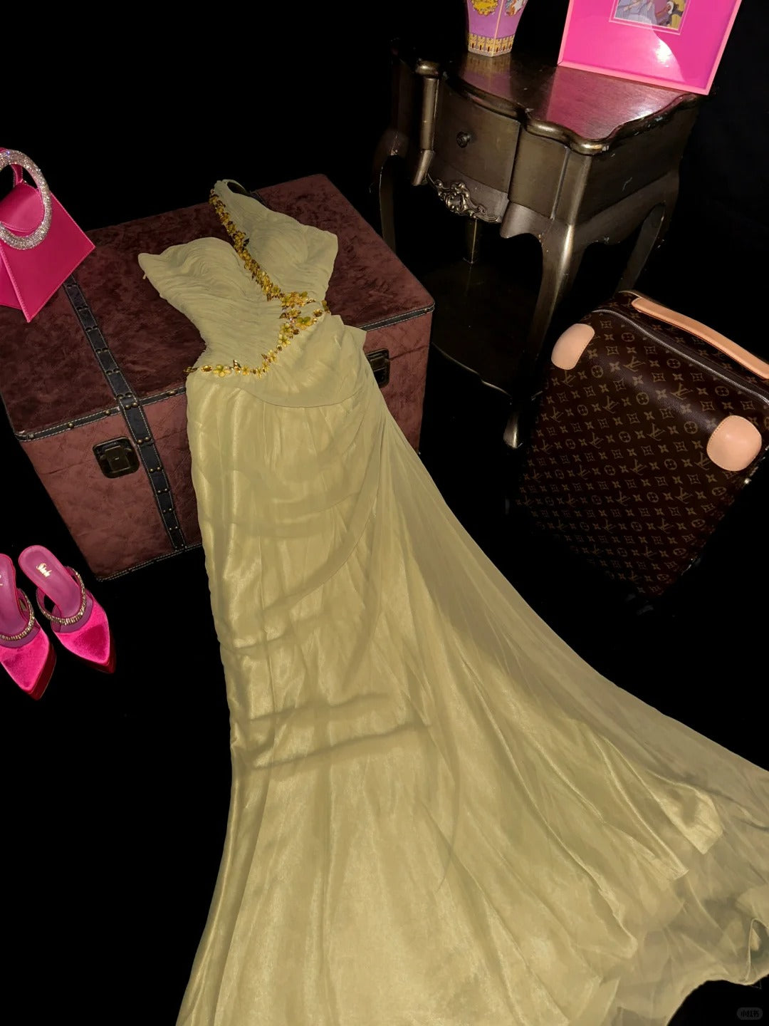 Beautiful Yellow Tulle One Shoulder Flower Diamond Long Prom Dress P3449
