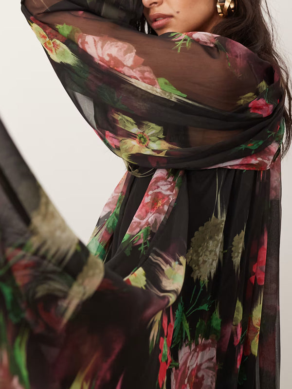 Black Floral Print Wide Sleeve Chiffon Maxi Dress