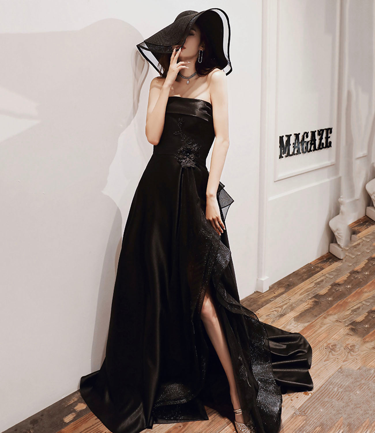 Black satin tulle high low prom dress evening dress