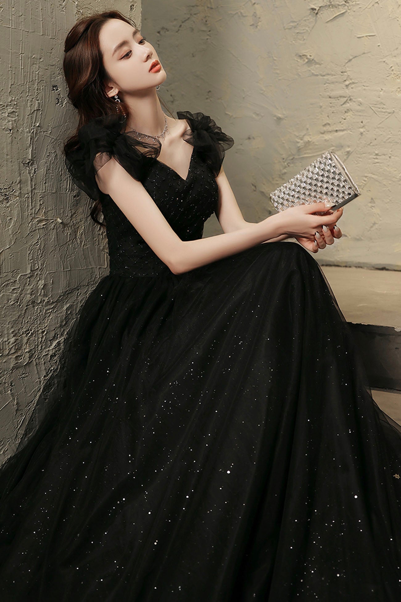 The black tulle fabric exudes an air of mystery and allure, creating a captivating look. The intricate beadwork adds a touch of glamour and sparkle, catching the light with every move you make.