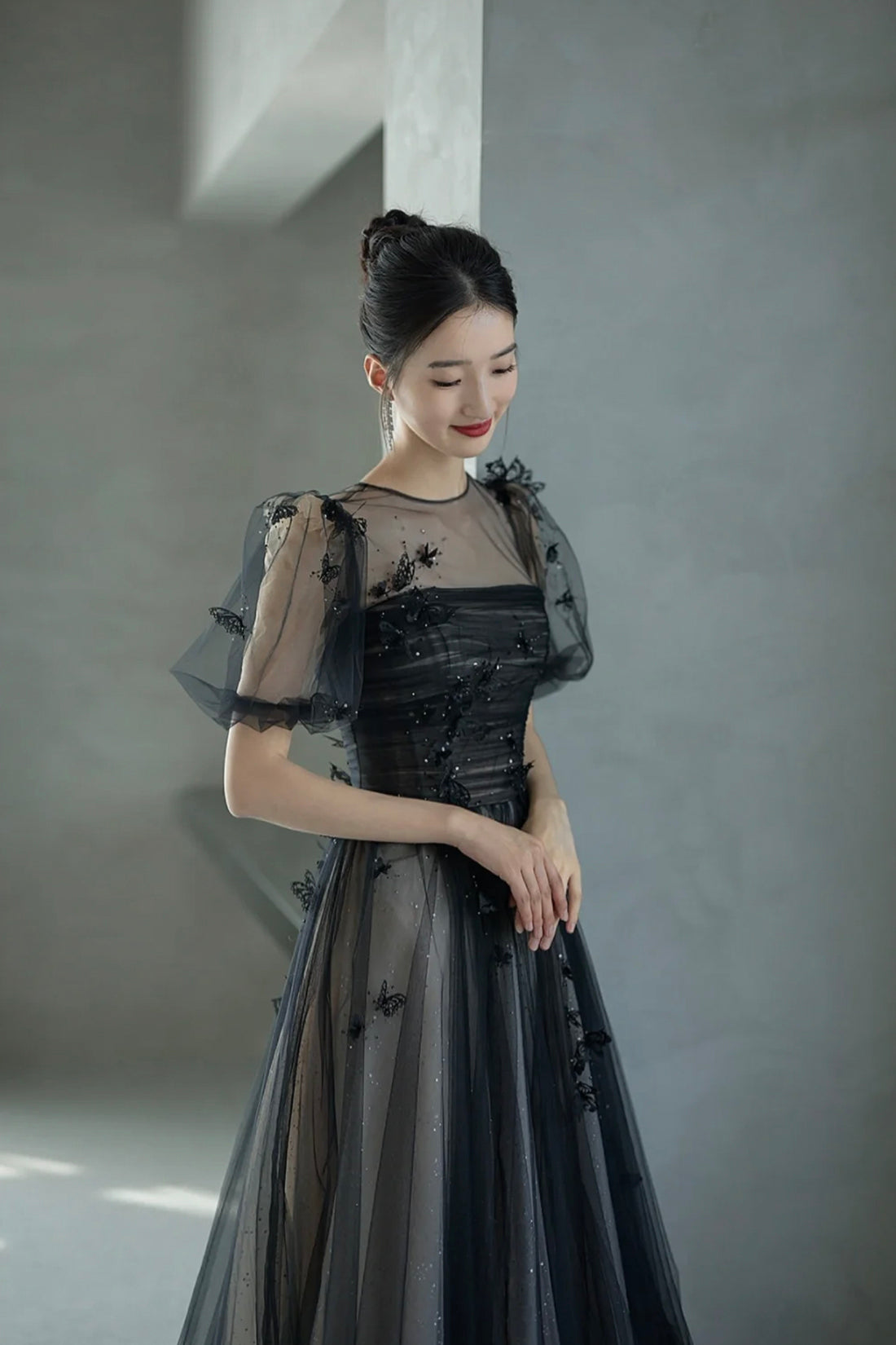 The_Black Tulle Beaded Long Prom Dress is a stunning A-line evening gown._ This A-line evening dress features charming puff sleeves, adding a touch of whimsy to your look. Adorned with delicate beadwork, this dress adds a touch of glamour. It's a perfect choice for those seeking elegance and sophistication at any formal event. Perfect for prom or any special event, this dress will make you feel like a true princess with its elegant design and flattering silhouette.