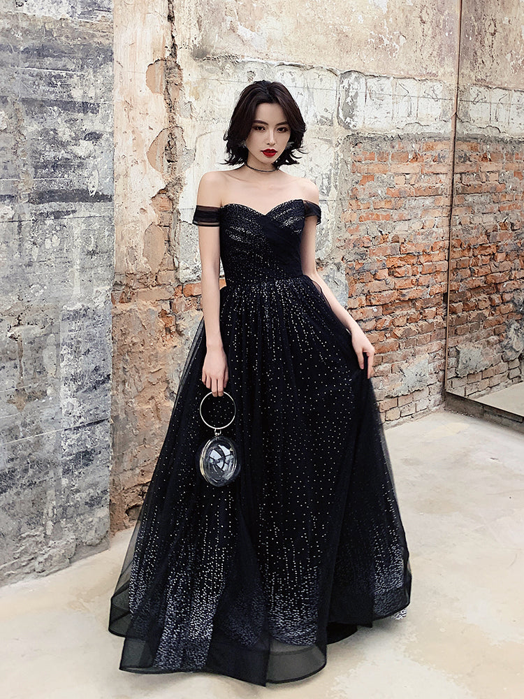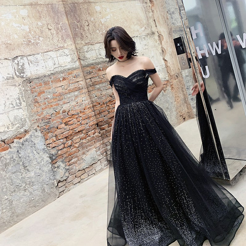 Black tulle sequins long prom dress, off shoulder evening dress 8080