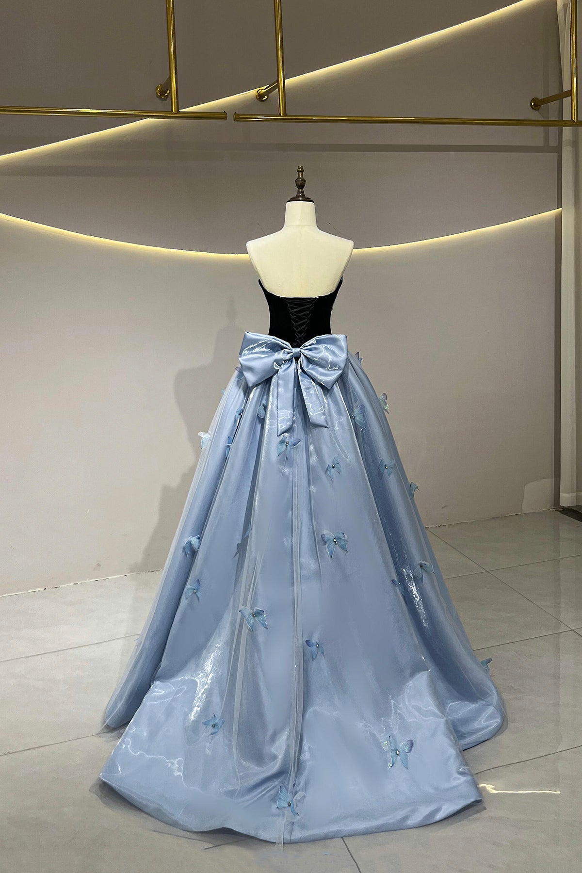 Black Velvet and Blue Satin Long Prom Dress, A-Line Strapless Party Dress