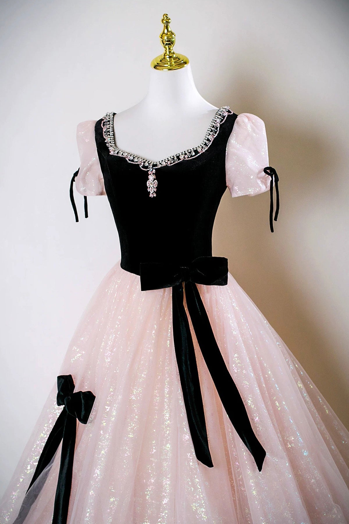 Black Velvet and Pink Tulle Long Prom Dress, A-Line Short Sleeve Party Dress