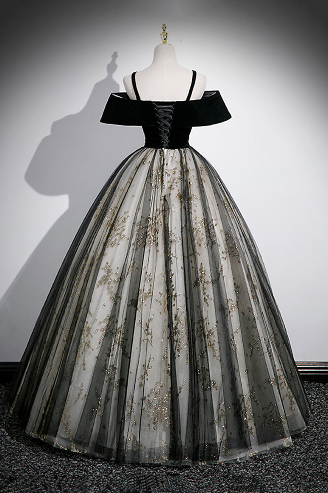 Black Velvet and Sequins Long Prom Dress, Black Off the Shoulder A-Line Evening Dress