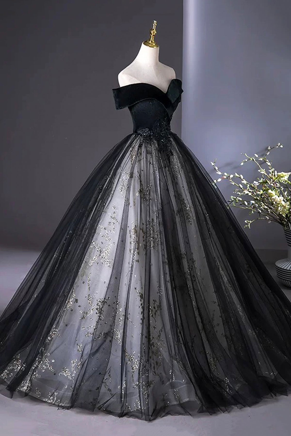 Black Velvet and Tulle Long A-Line Prom Dress, Elegant Off the Shoulder Party Dress