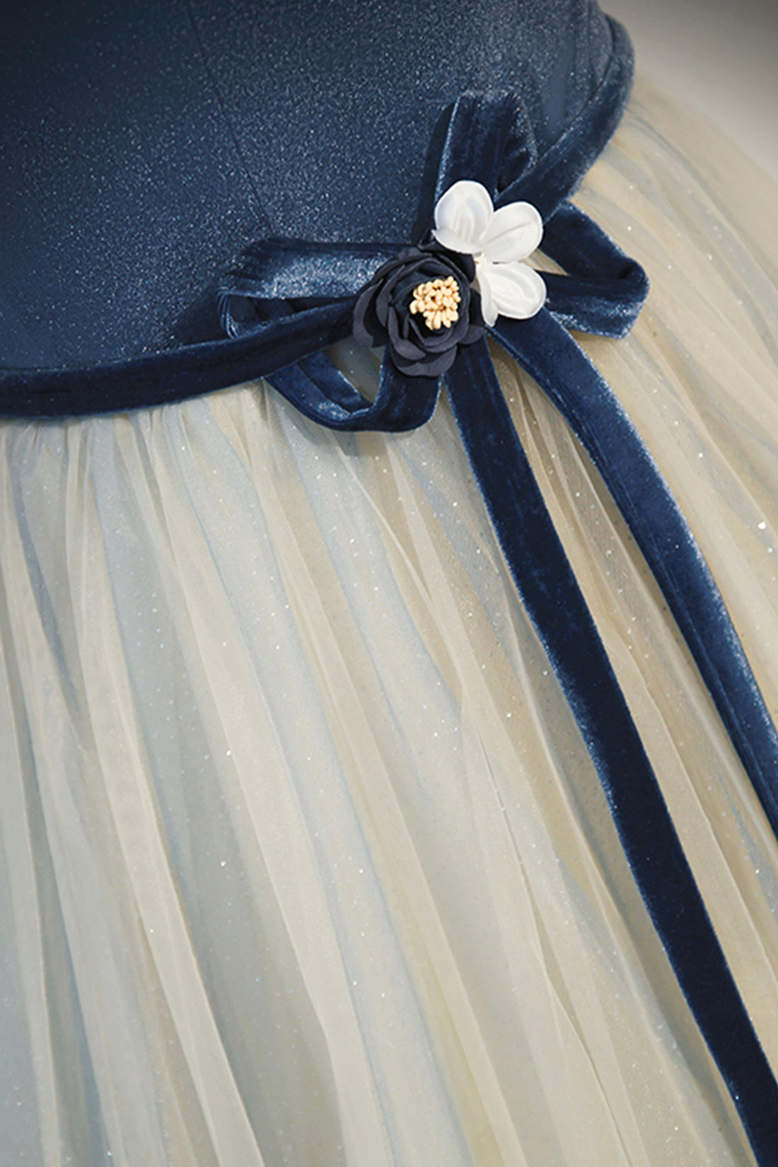 The_Blue Beading Appliques V-Neck Floor Length Prom Dress is a vision of elegance. With its flowing A-line silhouette and delicate tulle fabric, it offers a sense of grace and charm. The serene blue color adds a touch of enchantment, making it a perfect choice for proms, formal events, or any special occasion.