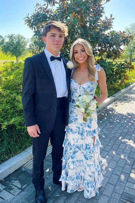 Blue elegant A-line layered chiffon floral backless long ball gown evening dress prom dress Graduation Dress gh2798