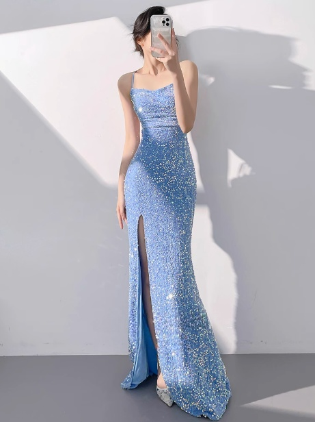 Blue Mermaid Sequin Spaghetti Strap Long Prom Dress, Formal Evening Dress ED01346