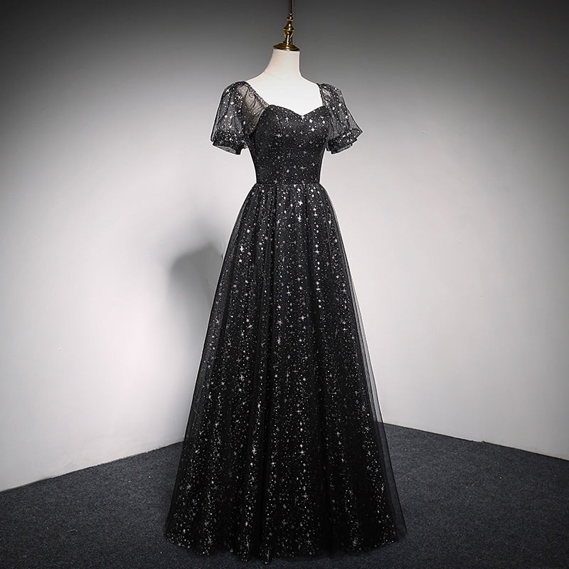 Blue tulle long A line prom dress blue evening dress
