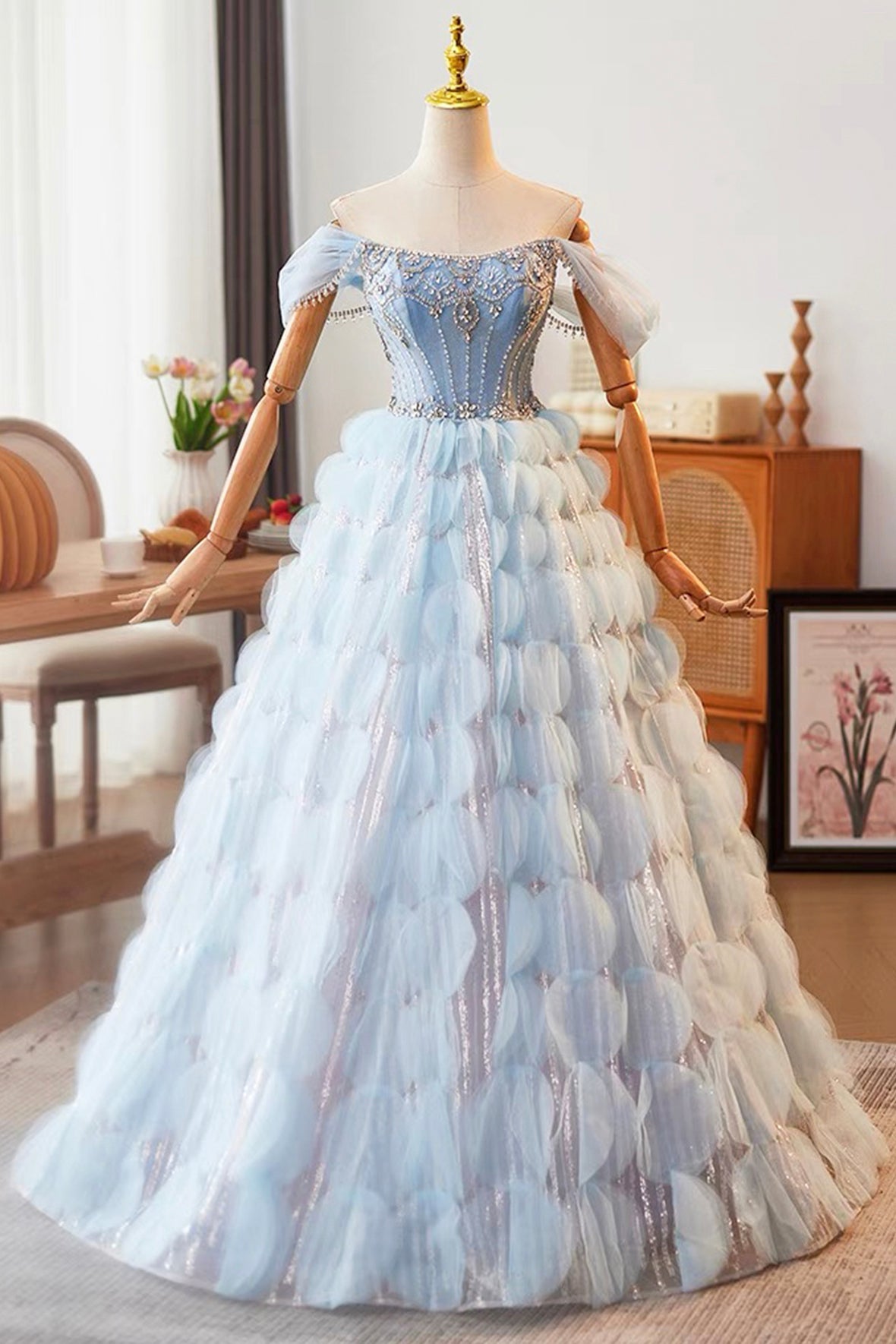Blue Tulle Long Prom Dress with Rhinestone Ruffles, Beautiful Off the Shoulder Party Dress