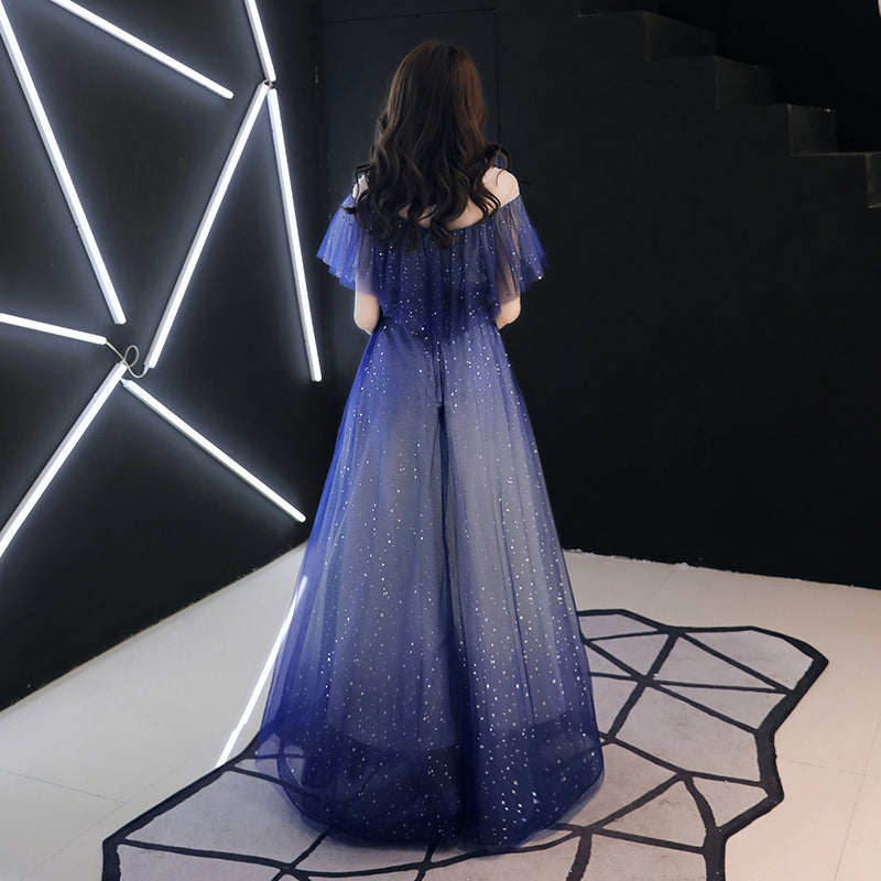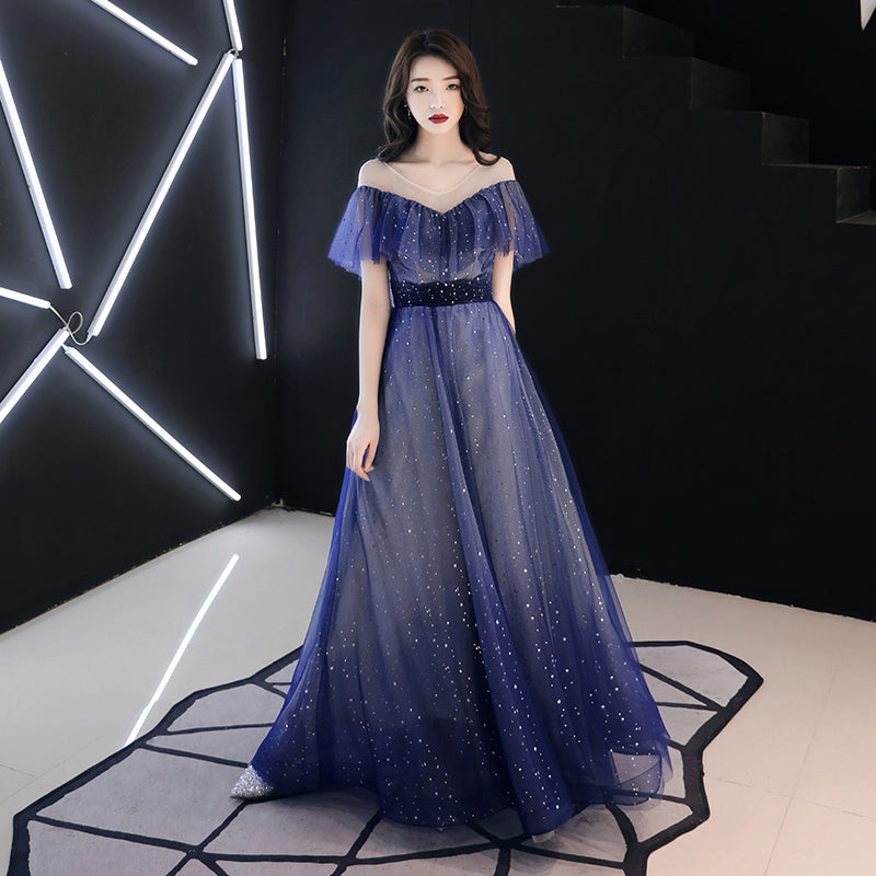 Blue tulle sequins long prom dress