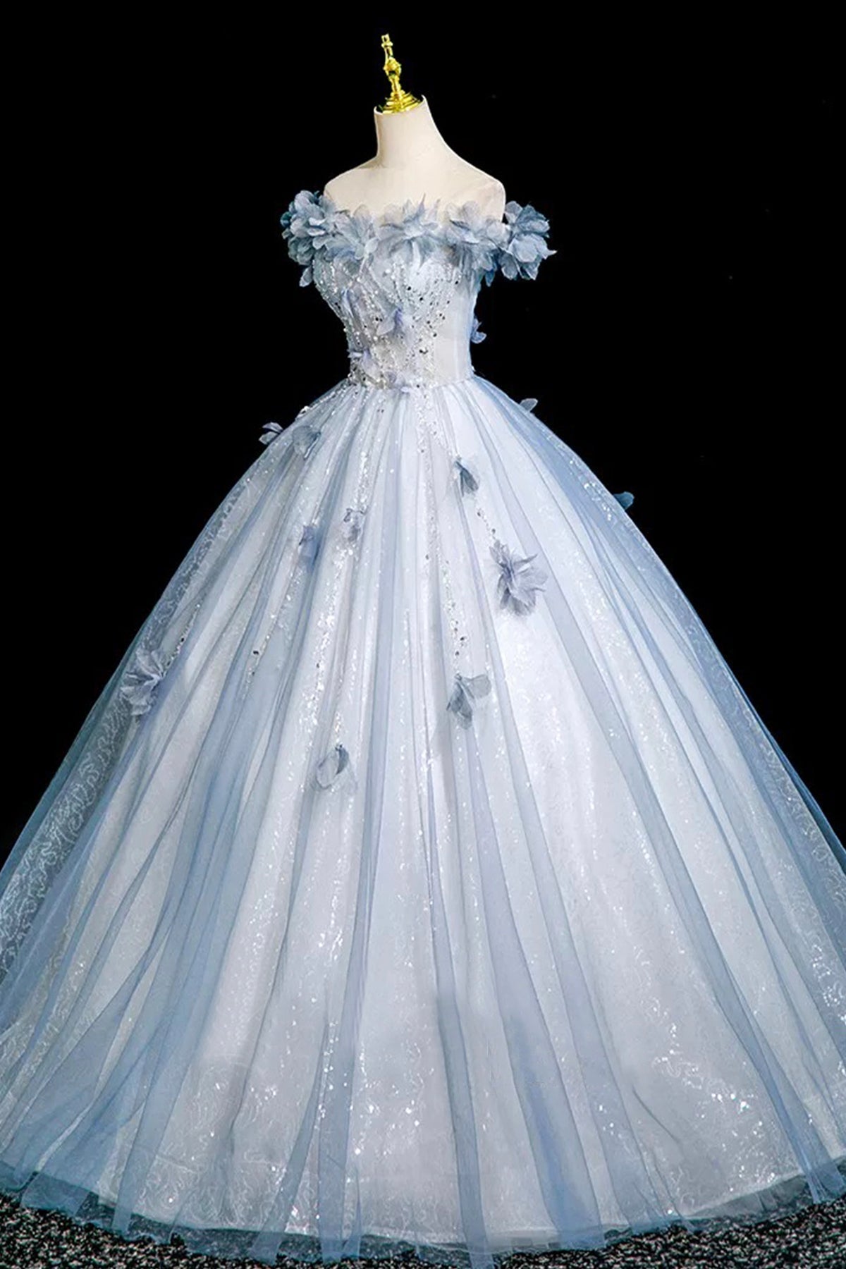 Blue Tulle Sequins Long Prom Dress, A-Line Off the Shoulder Party Dress
