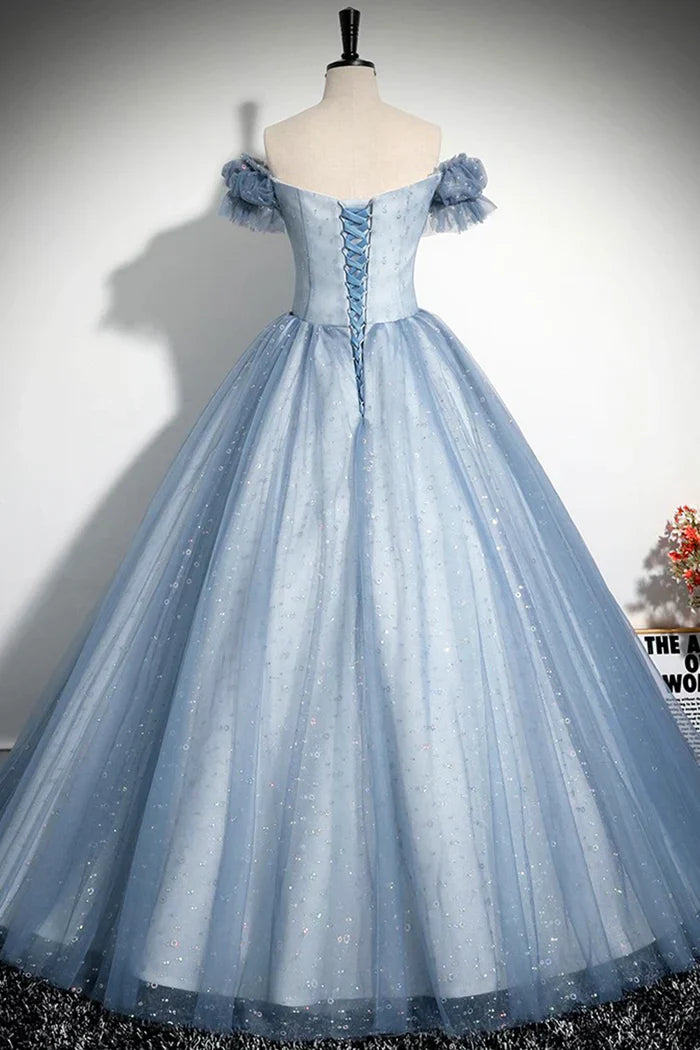 Gray Blue A-Line Tulle Sequins Long Prom Dress, Beautiful Gray Blue Evening Party Dress ED0997